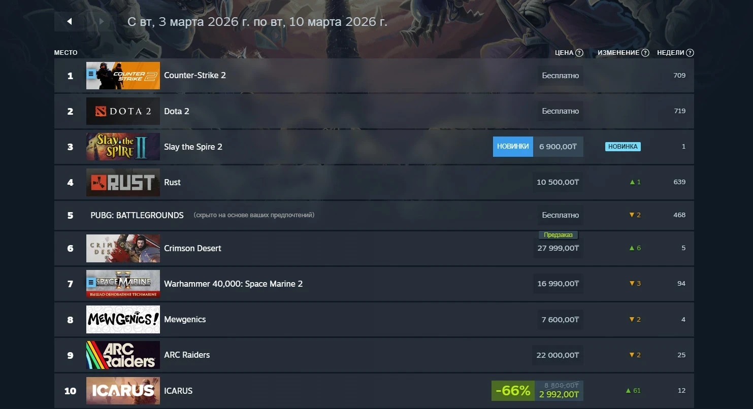 В российском сегменте Steam также не обошлось без Slay the Spire 2 — новинка заняла третье место, уступив лишь нерушимым мастодонтам в лице Counter-Strike 2 и Dota 2. Также отечественные игроки активно оформляют предзаказы Crimson Desert. А первую десятку закрыла ICARUS — выживалка поднялась на 61 позицию за счёт скидки в 66%.