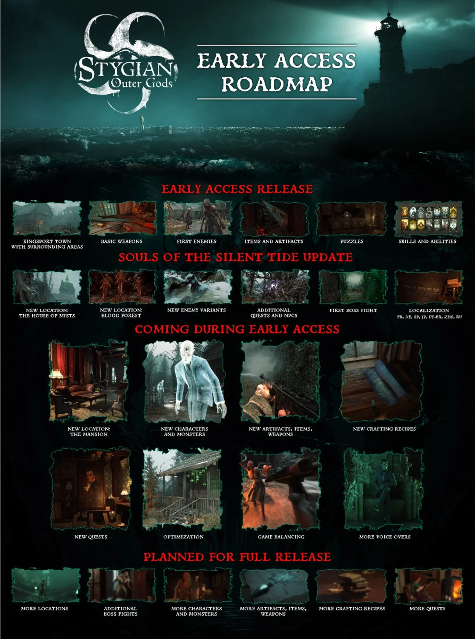 Создатели игры на этапе раннего доступа планируют добавить карту Mansion, новых героев и монстров, оружие и артефакты, а также квесты, рецепты для крафта. Кроме того, обещают заняться оптимизацией, балансом и дополнительными вариантами озвучки. Всё это ожидается уже осенью 2025.